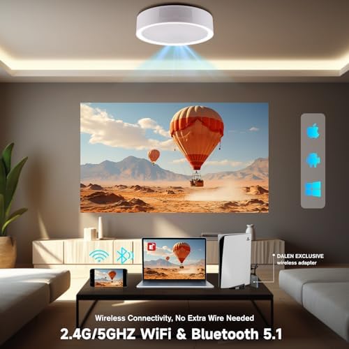 📺【SMOOTH WIRELESS CONNECTIVITY】 The ceiling projector supports wireless connectivity for iOS (iMirror only for iOS), Android, and Windows devices. With 5GHz Wi-Fi technology, stable and fast connections to your devices can be achieved without the need for any external cables or instruments. Additionally, you can install the E-Share APP for convenient screen mirroring of your electronic devices. Utilizing Bluetooth 5.1, it can connect to various Bluetooth speakers and audio devices for an immersive audio experience.