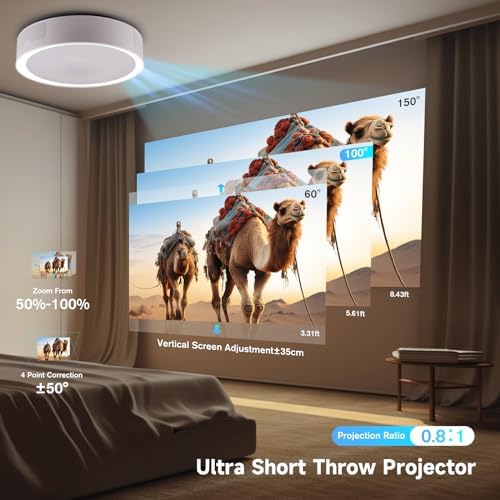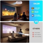 📺【CUSTOMIZABLE IMAGE SETTING】The DALEN home projector has an ultra-short throw ratio of 0.8:1, creating a 100-inch screen with just 5.61 feet and a maximum size of 150 inches. It offers an adjustable screen for comfortable viewing, both seated and reclining. The projection screen zoom function allows sizing from 50% to 100%, and auto-focus and keystone correction ensure accurate and rapid focusing, correcting image distortions effectively.