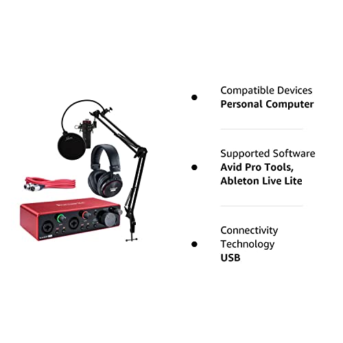 Bundle Includes: Focusrite Scarlett 2i2 Studio 3rd Gen 2×2 USB Audio Interface with Pro Tools, Microphone Suspension Boom Scissor Arm with 5/8-27 Threading, Basic Microphone Shock Mount, and Pop Filter