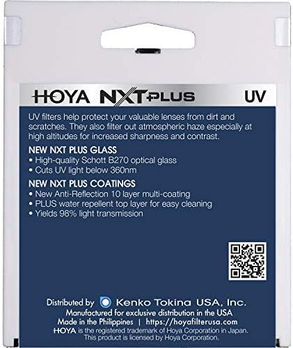 The Hoya NXT Plus UV Filter is a multi-purpose filter that is most commonly used to protect the front of your lens, a first line of defense against scratches, rain, dirt and dust. Hoya’s NXT Plus UV is a powerful upgrade to the best-selling NXT series. This filter applies a waterproof top coat to Schott B270 glass polished smooth for maximum sharpness. There are two advantages to having a premium waterproof coating: (1) Water beads-up quickly, and easily slides off the surface of the filter for streak-free shooting. (2) It also makes the filter a lot easier to clean when dirt, water, and smudges make their way onto the surface.