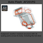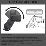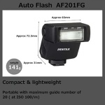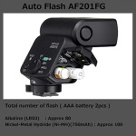 The new AF201FG was designed with the active photographer in mind, including a dust-resistant and drip- proof, all-weather construction that prevents the entry of water and dust into the lens. It provides an advanced flash application, including bounce flash functionality, which is adjustable to angles of -10 to 90 degrees vertically. The AF201Fg flash unit, coupled with its weather-resistant body, provides yet another tool to enhance the photographic experience while keeping in mind the extreme conditions our photographers go to get the perfect shot. The AF201FG flash has an assignable mode button that allows the shooter to program their settings to their liking. Users can select from 5 modes including, Off, P-TTL (leading curtain sync), P-TTL (trailing curtain sync), Manual (full), and Manual (1/4). Powered by two AA batteries.