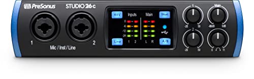 Great for recording studios, mobile musicians, guitarists, podcasters, and live streaming, the bus-powered Studio 26c 2-in, 2-out audio interface features 2 front-panel combo mic/line/instrument inputs with PreSonus XMAX-L solid-state mic preamps, 2 rear-panel line outputs, MIDI I/O, and onboard direct monitoring control. A complete, all-in-one home recording studio, the Studio 26c comes with PreSonus’ award-winning Studio One Artist music production software for macOS and Windows.