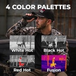 Features Black Hot, White Hot, Red Hot, and Fusion palettes with highest temperature spot tracking and multi-language menu.