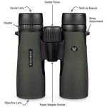 Adjustable eyecups twist up and down for comfortable viewing with or without eyeglasses. Center focus wheel adjusts the focus of both binocular barrels at the same time. Diopter (located on right eyepiece) adjusts for differences in a user’s eyes.
